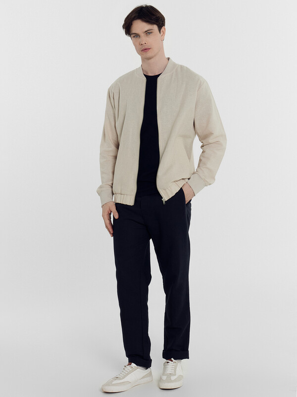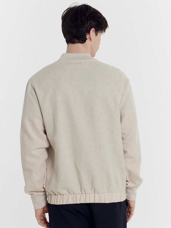 Горловина круглой формы с воротником-стойкой из рибаны. Шов втачивания воротника закрыт хб тесьмой. Рукав втачной, длинный, на манжете из рибаны.