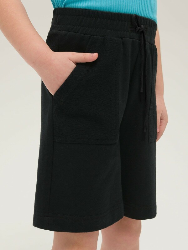 Шорты-бермуды из футера для девочек. 100% хлопок в составе – ткань мягкая, дышащая, приятная на ощупь. Широкая резинка по линии талии – отлично сидит, не натирает, объем регулируется наружным шнуром. Декоративная обработка швов, накладные карманы – отражают тренд сезона. Карманы имеют комфортный вход для рук, их удобно использовать по прямому назначению. Длина модели акцентирует внимание на ногах, одновременно не стесняет и не сковывает движения. Шорты подходят на каждый день и для активного отдыха. В многослойном образе великолепно сочетаются с кроп-топом и футболкой.