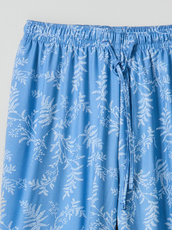 Бриджи женские прямого силуэта. Пояс цельнокроеный, с втачной эластичной тесьмой 40RV. По центу пояса пробиты петли, протянут шнур из основного полотна. Низ обработан швом в подгибку.