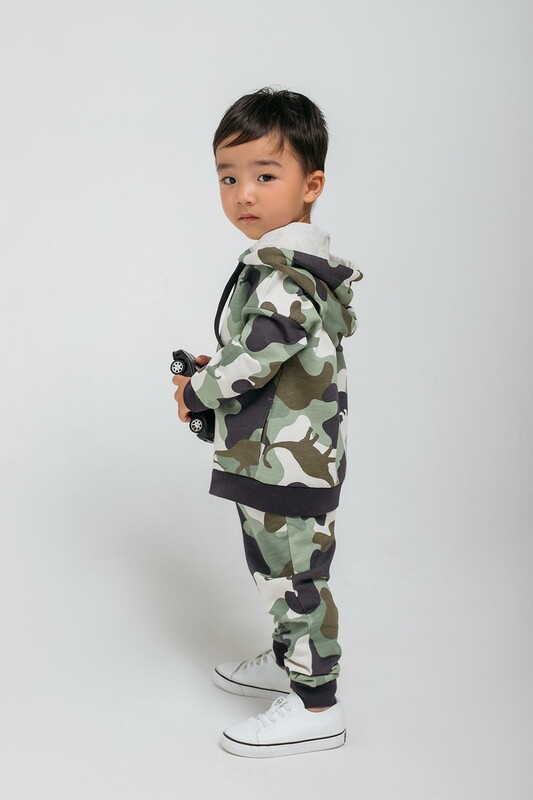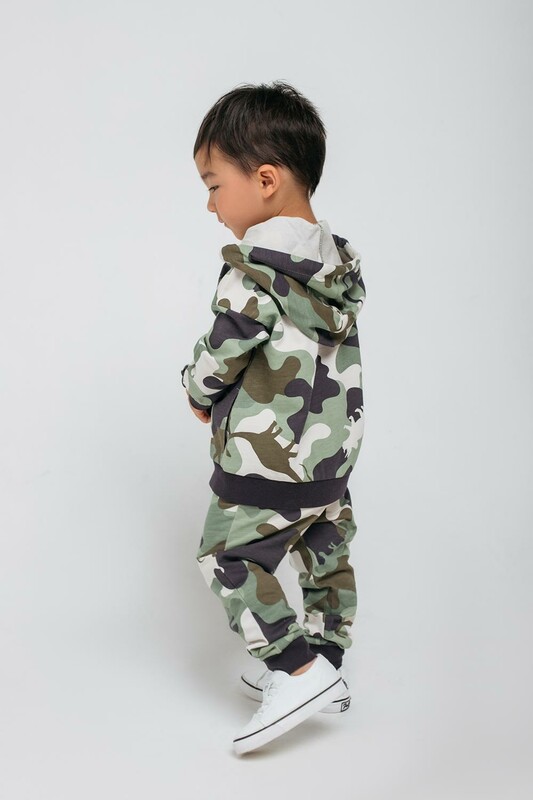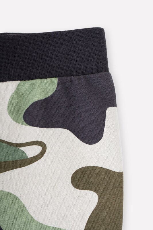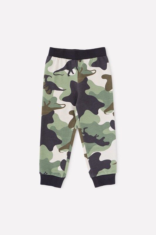 Брюки из набивного петельчатого футера с эластичным поясом. Украшены камуфляжным рисунком с динозаврами. Внизу мягкие манжеты.