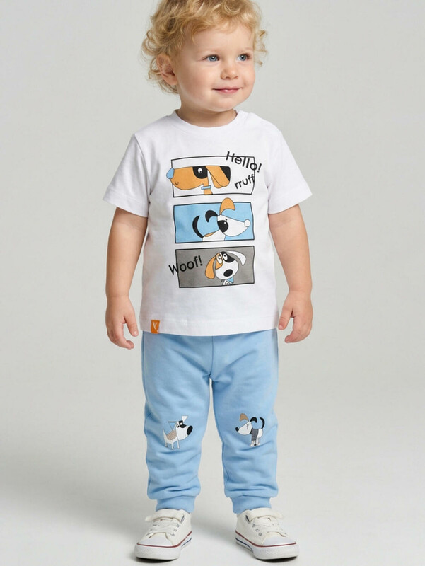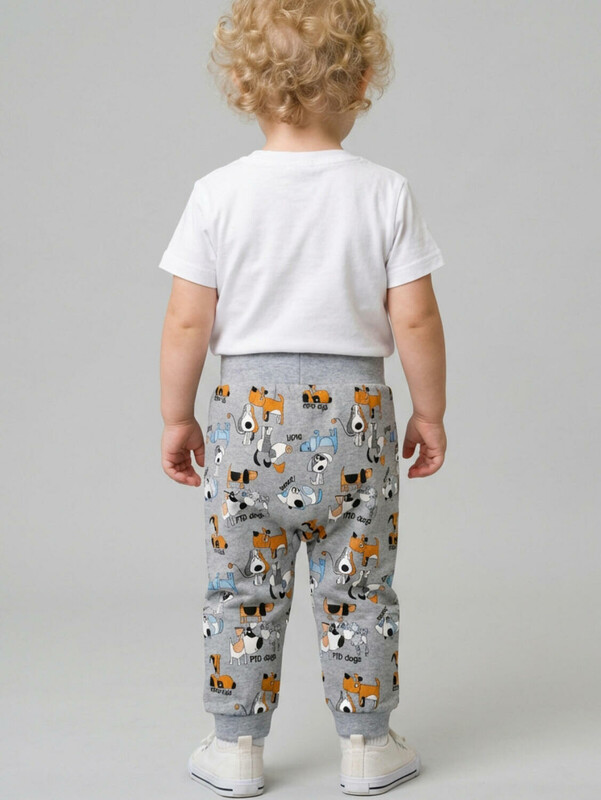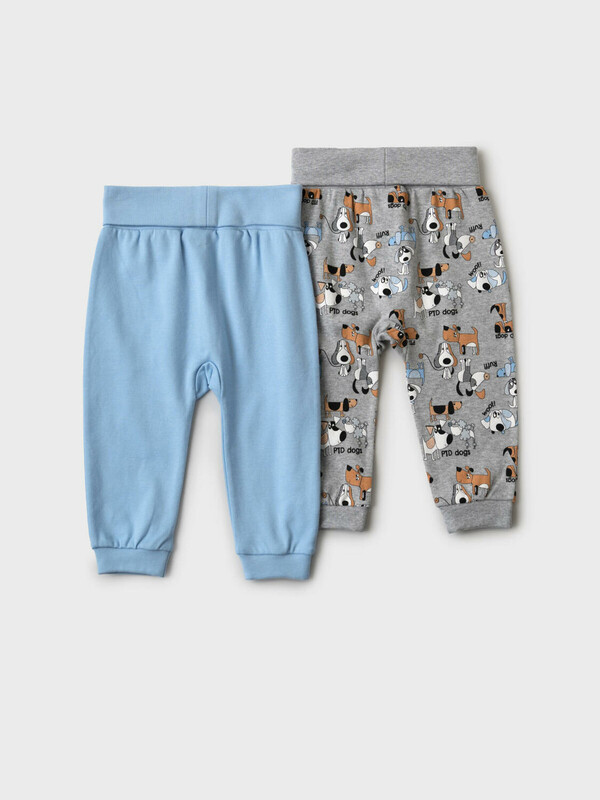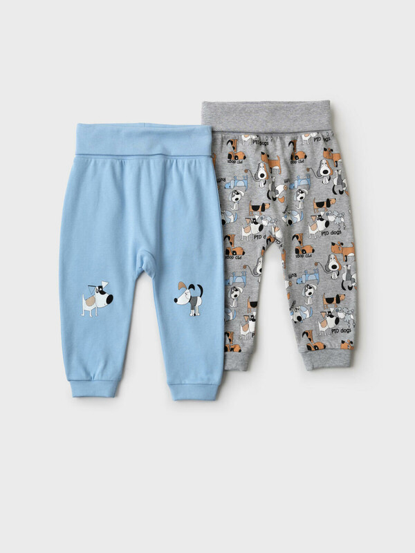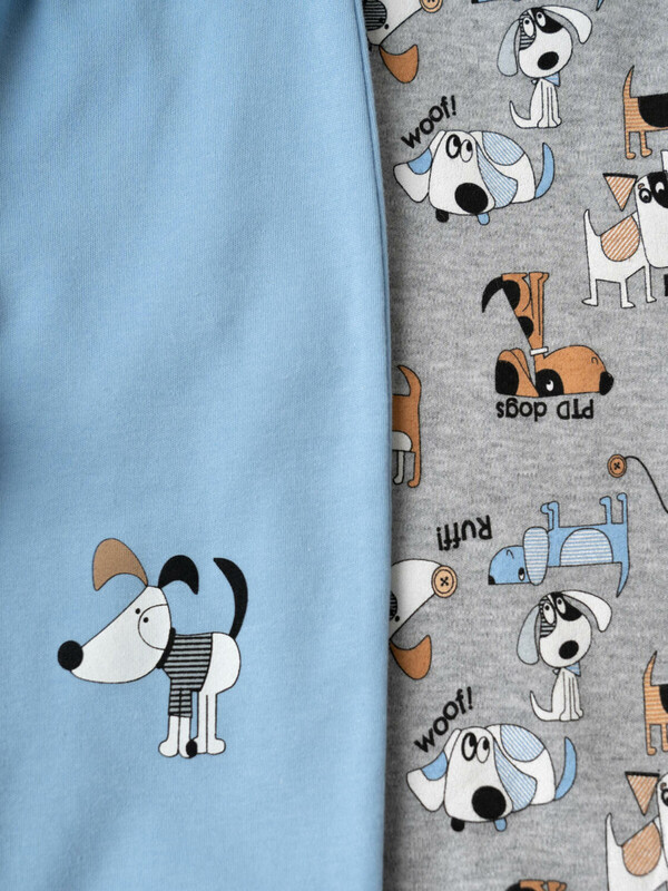 Набор детских брюк для мальчика. Комплект из 2 брюк выполнен из хлопкового трикотажа интерлок. Модель прямого кроя со средней посадкой на талии. Пояс выполнен на широкой мягкой резинке. В нижней части брючин предусмотрены эластичные трикотажные манжеты для лучшей посадки. Принты с милыми собачками.