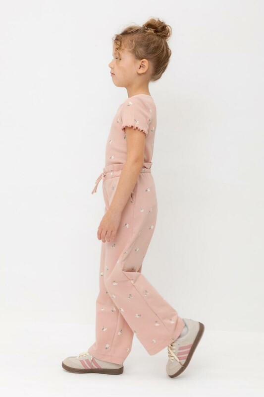 Удобные трикотажные брюки для девочки из высококачественного хлопка. Эластичный пояс регулируется при помощи шнурка. Оригинальная набивка выполнена из стойких текстильных гипоаллергенных красителей. Изделие сохраняет цвет и форму после многократных стирок.