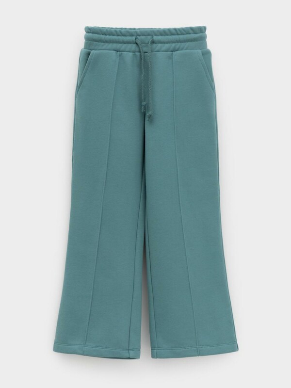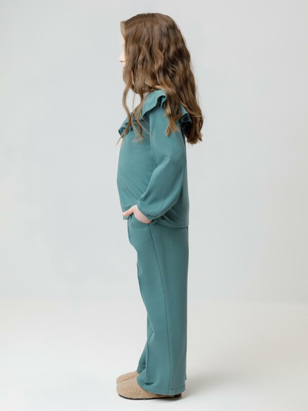 Прямые брюки со стрелками для девочки из мягкого петельчатого трикотажа. Эластичный пояс на резинке регулируется по ширине с помощью шнурка. По бокам два удобных кармана. Спереди застроченные стрелки. Изделие сохраняет цвет и форму после многократных стирок. Все трикотажные полотна производятся в соответствии с нормами швейцарского сертификата ЭкоТекс.