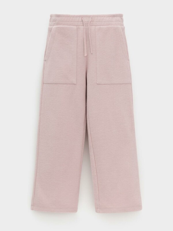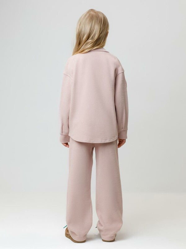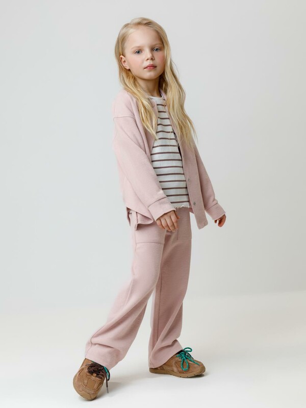 Прямые брюки для девочки из мягкого трикотажа селаник с peach эффектом. Peach эффект достигается с помощью технологии обработки полотна, при которой на его поверхности создаётся лёгкий ворс, напоминающий нежную текстуру кожи персика. Эластичный пояс на резинке регулируется по ширине с помощью шнурка. По бокам два удобных накладных кармана. Изделие сохраняет цвет и форму после многократных стирок. Все трикотажные полотна производятся в соответствии с нормами швейцарского сертификата ЭкоТекс.