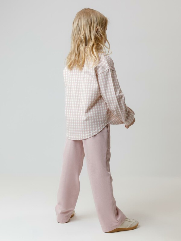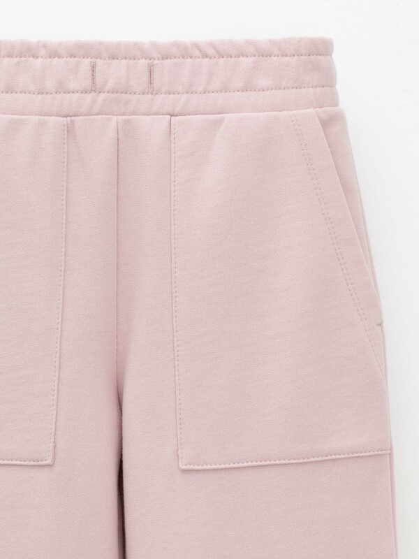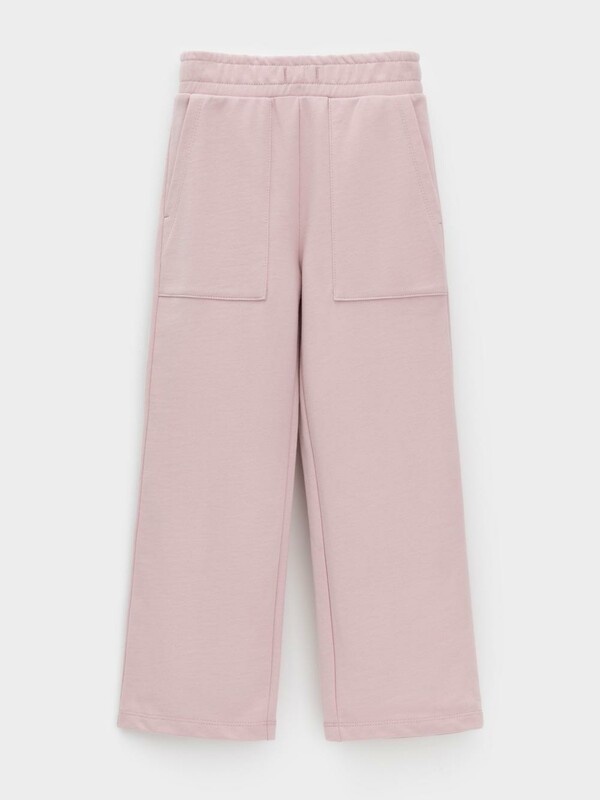 Прямые брюки для девочки из мягкого петельчатого трикотажа. Эластичный пояс на резинке регулируется по ширине с помощью шнурка. По бокам два удобных накладных кармана. Изделие сохраняет цвет и форму после многократных стирок. Все трикотажные полотна производятся в соответствии с нормами швейцарского сертификата ЭкоТекс.