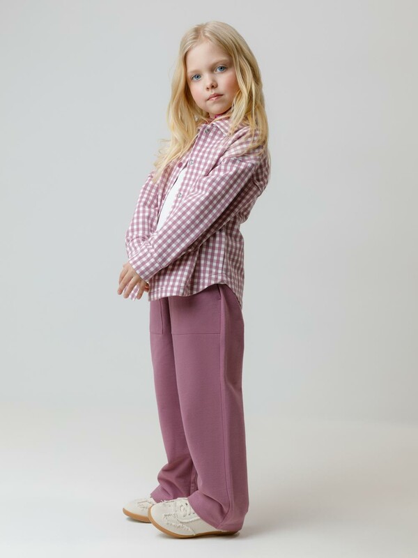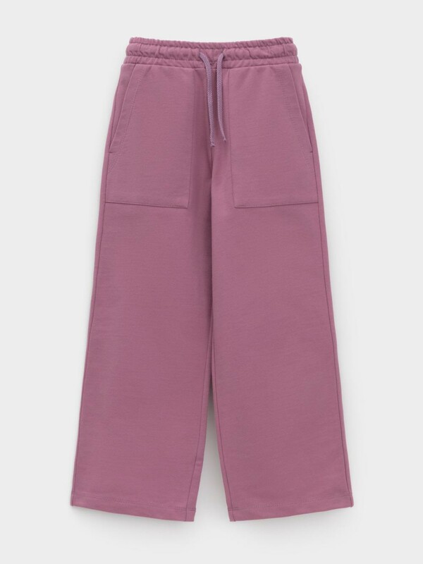 Прямые брюки для девочки из мягкого петельчатого трикотажа. Эластичный пояс на резинке регулируется по ширине с помощью шнурка. По бокам два удобных накладных кармана. Изделие сохраняет цвет и форму после многократных стирок. Все трикотажные полотна производятся в соответствии с нормами швейцарского сертификата ЭкоТекс.