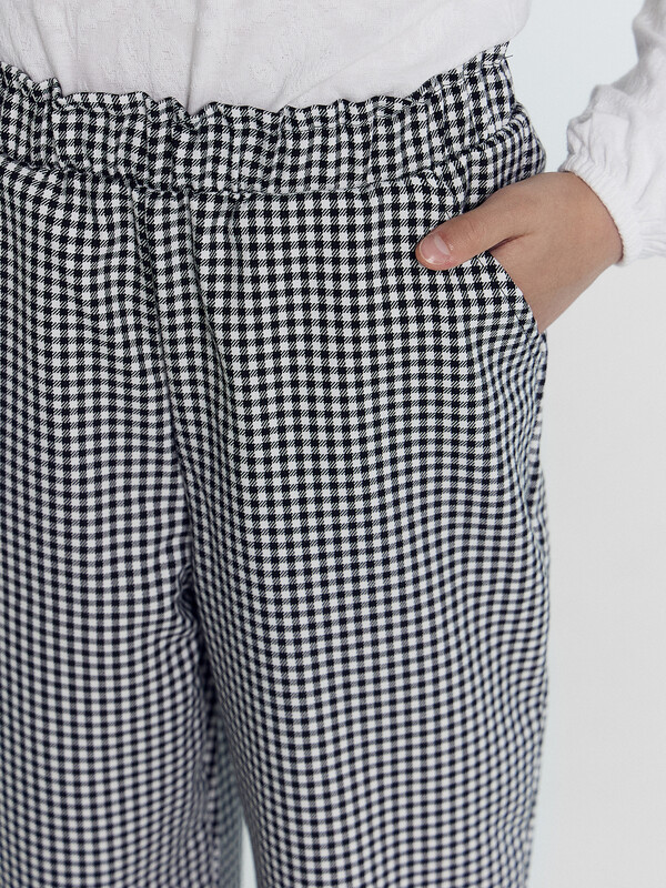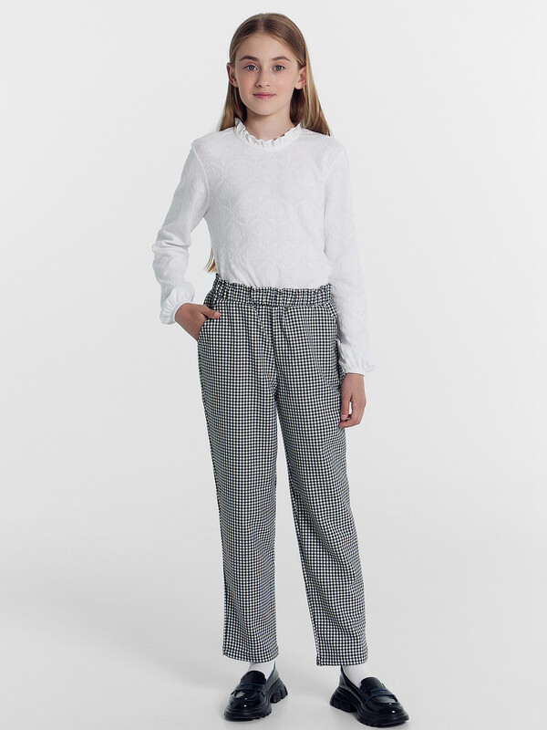 Брюки прямого силуэта. Посадка высокая. Пояс отрезной с эластичной тесьмой внутри. На передних половинках обработаны карманы с наклонным входом от боковых швов. Низ изделия обработан швом в подгибку.