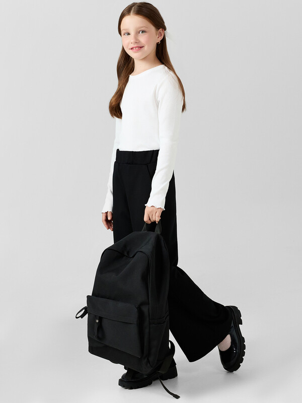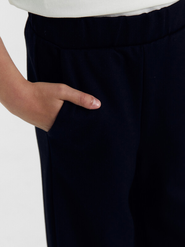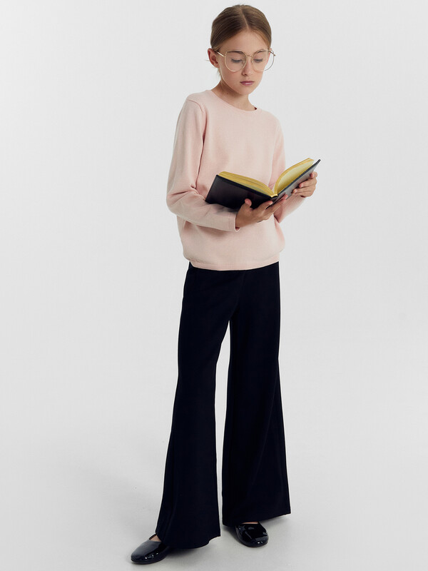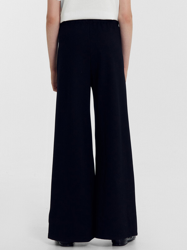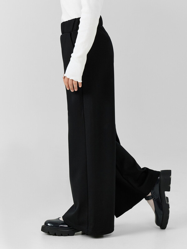 Брюки для девочек расширенного силуэта. Высокая посадка, пояс отрезной с эластичной тесьмой RV50 внутри. Спереди карманы с отрезным бочком. Без застежки. Низ обработан швом в подгибку на двухигольной плоскошовной машине.