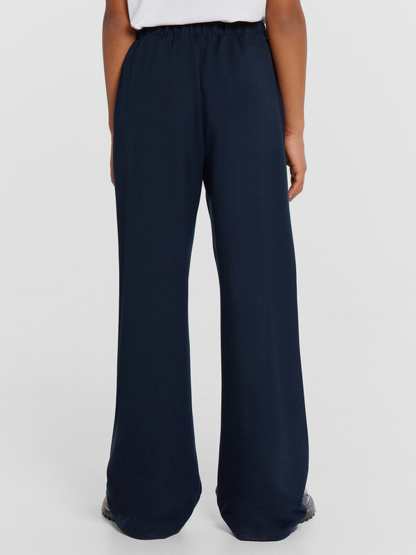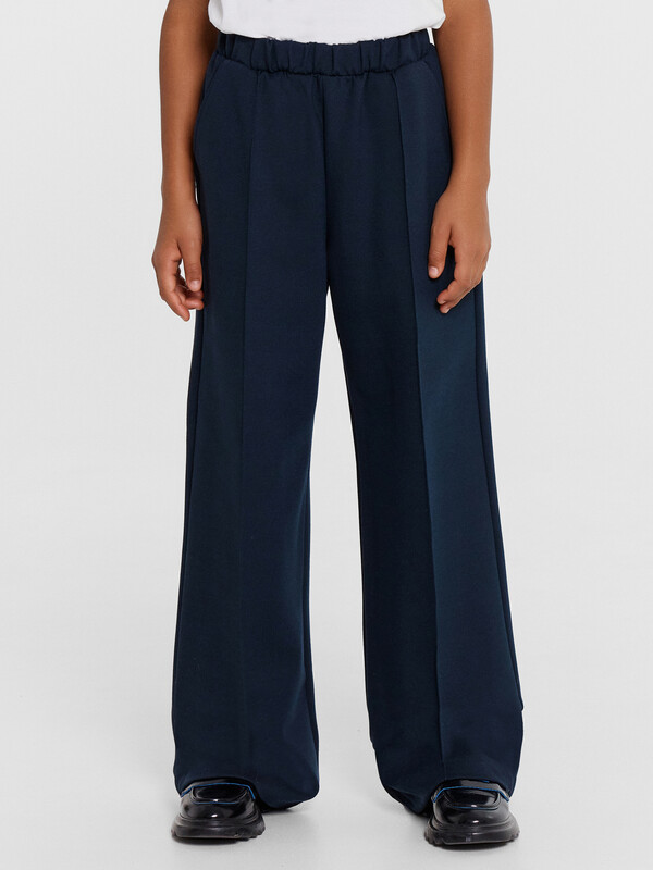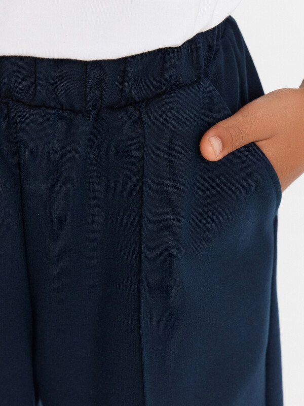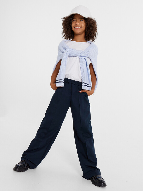 Брюки для девочек свободного силуэта. Средняя посадка, пояс отрезной с эластичной тесьмой RV40 внутри. Брюки со стрелками, спереди карманы с отрезным бочком. Без застежки. Низ обработан швом в подгибку на двухигольной плоскошовной машине.