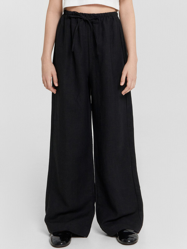 Брюки для девочек прямиго силуэта. Средняя посадка, пояс отрезной с эластичной тесьмой внутри 20RV. В поясе пробиты петли и втянут шнур из основного полотна. Низ обработан швом в подгибку.
