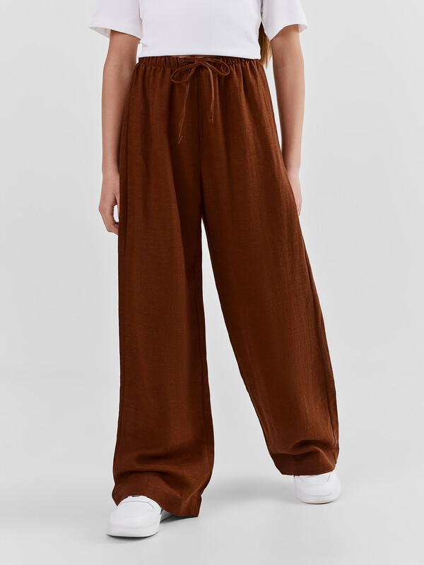 Брюки для девочек прямиго силуэта. Средняя посадка, пояс отрезной с эластичной тесьмой внутри 20RV. В поясе пробиты петли и втянут шнур из основного полотна. Низ обработан швом в подгибку.