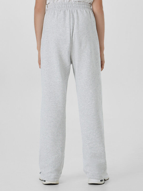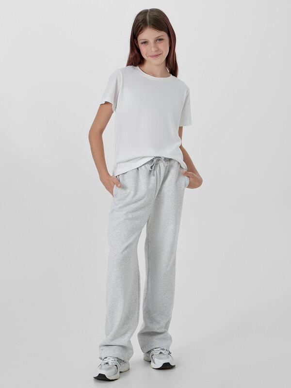 Брюки прямого силуэта, с высокой посадкой. Пояс отрезной из рибаны, с эластичной тесьмой внутри 50RV. По бокам настрочены лампасы из кулирки. Нижние срезы брюк обработаны швом вподгибку.