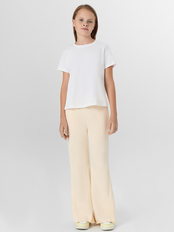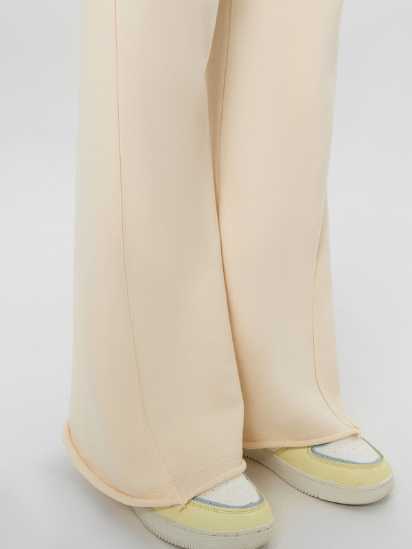 Брюки свободного силуэта с высокой посадкой. Пояс цельнокроенный с эластичной тесьмой внутри 30RV. По поясу сделаны 2 отделочные строчки. Боковые швы перенесены вперед. Карманы в боковых швах. Низ с открытым срезом. По низу сделана отделочная строчка.