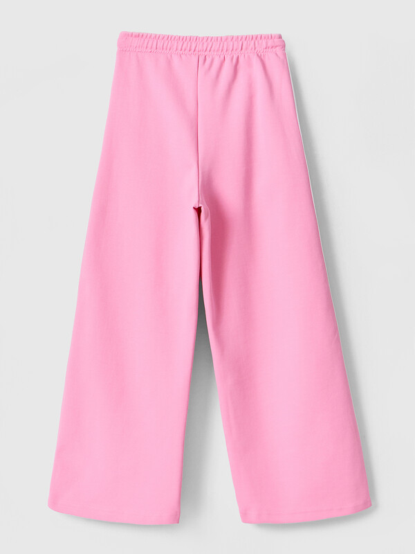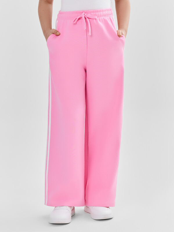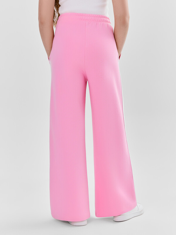 Брюки прямые свободные, посадка средняя. Пояс отрезной, с эластичной тесьмой внутри (внутренняя 40мм 40RV). С внешней стороны пробиты петли и вставлен шнур 10PX-2. В боковых швах обработаны карманы. По бокам лампасы из кулирного полотна. Нижний срез брюк обработан швом вподгибку.