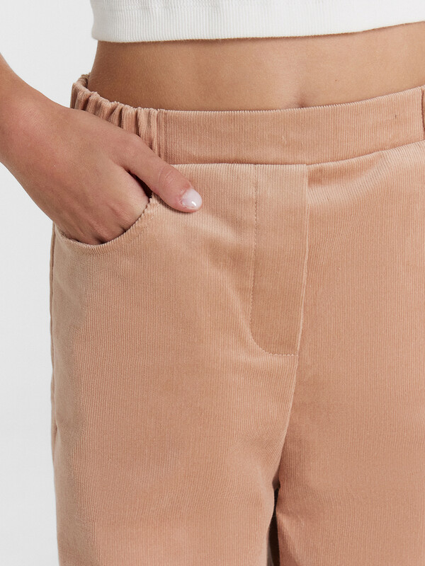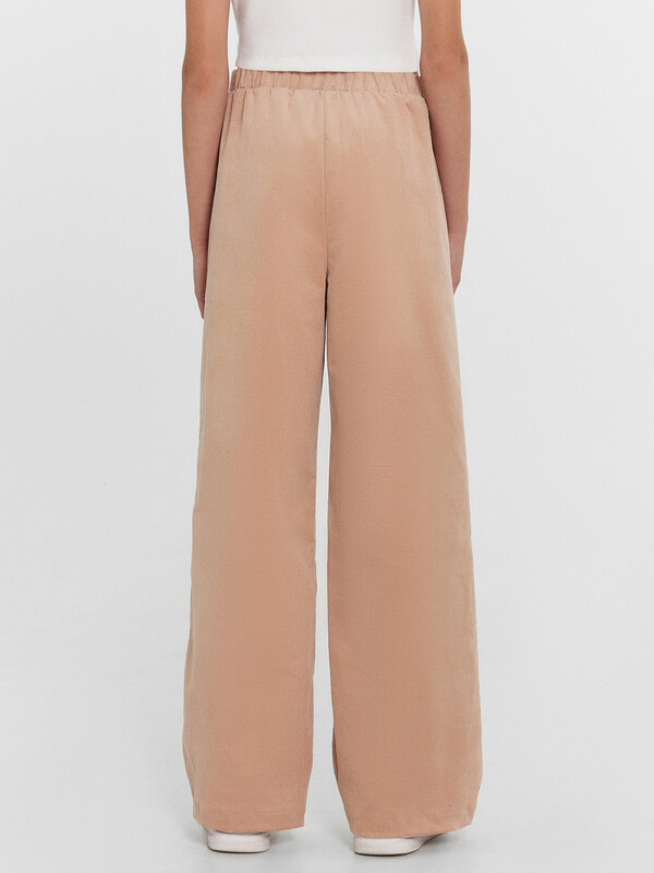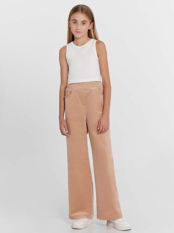 Брюки прямого силуэта. Посадка на талии. Пояс отрезной по переду гладкий, задняя деталь пояса с резиной внутри 40RV. По переду изделия карманы с отрезным бочком. Низ изделия обработан швом в подгибку.