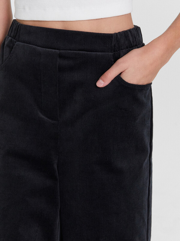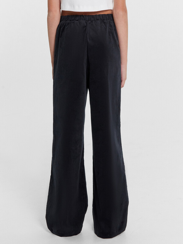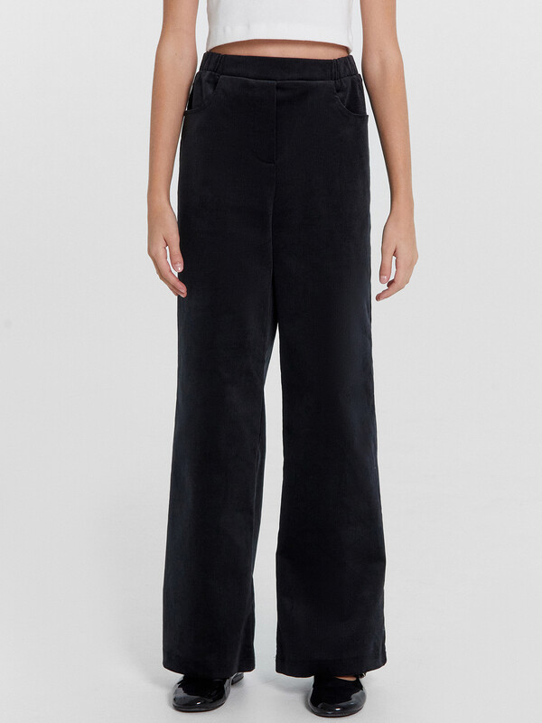 Брюки прямого силуэта. Посадка на талии. Пояс отрезной по переду гладкий, задняя деталь пояса с резиной внутри 40RV. По переду изделия карманы с отрезным бочком. Низ изделия обработан швом в подгибку.