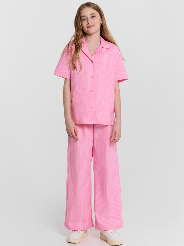 Брюки прямого силуэта. Посадка на талии. Пояс отрезной по переду гладкий, задняя деталь пояса с резиной внутри 40RV. По переду изделия карманы с отрезным бочком. Низ изделия обработан швом в подгибку.