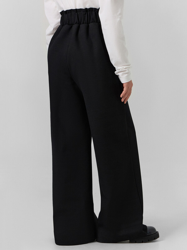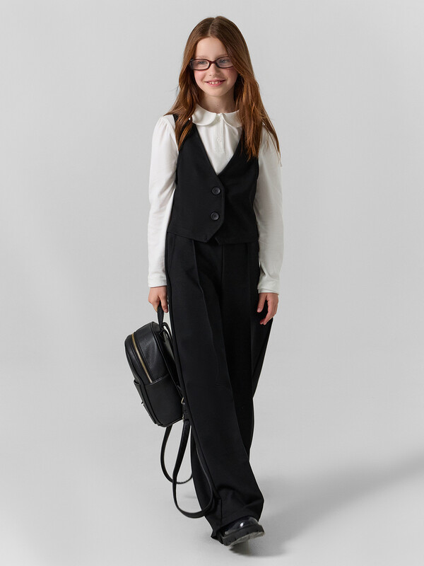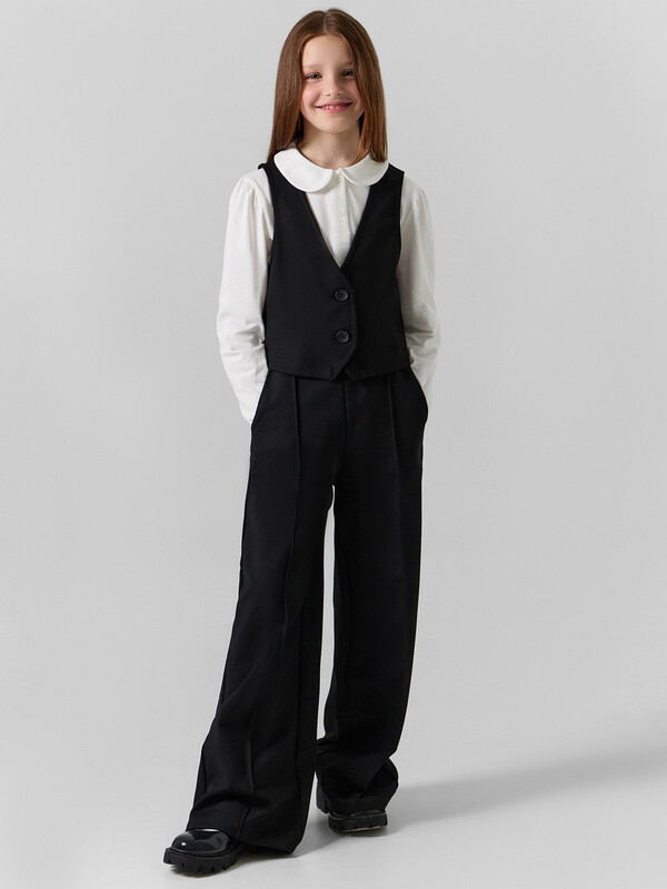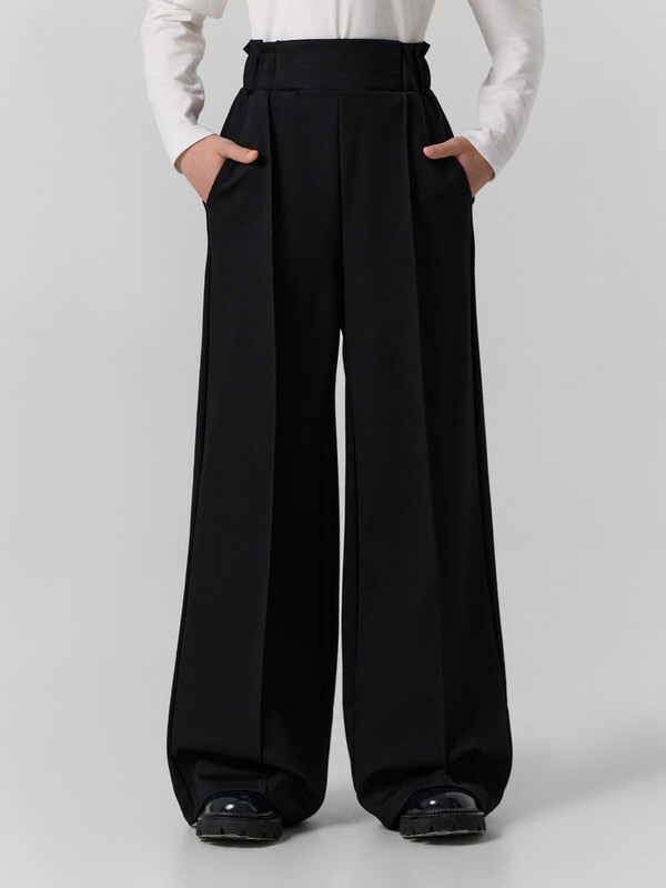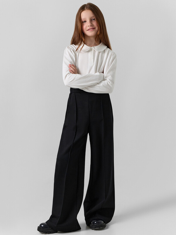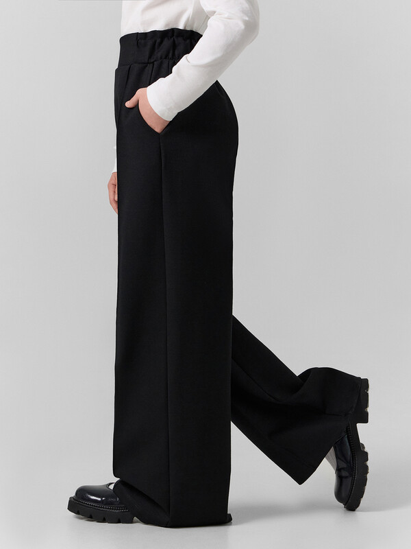 Брюки для девочек свободного силуэта. Средняя посадка, пояс отрезной спереди -гладкий , сзади с эластичной тесьмой внутри 50RV. Брюки со стрелками, спереди карманы с отрезным бочком. Без застежки. Низ обработан швом в подгибку на двухигольной плоскошовной машине.