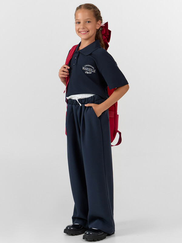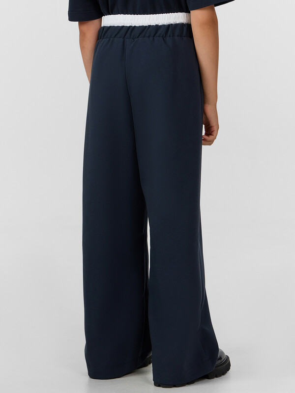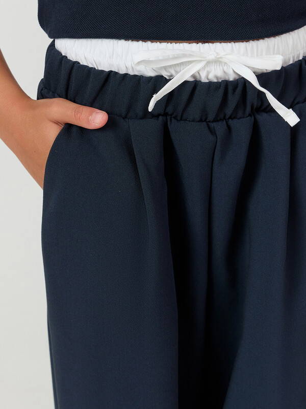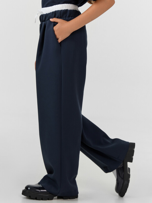 Брюки прямые свободного силуэта. Посадка на талии. Пояс отрезной с внутенней резиной 30RV. По верхнему срезу притачная деталь из поплина на сборке посередине декоративная тесьма имитирующая бантика из основного полотна. Низ брюк обработан швом в подгибку.