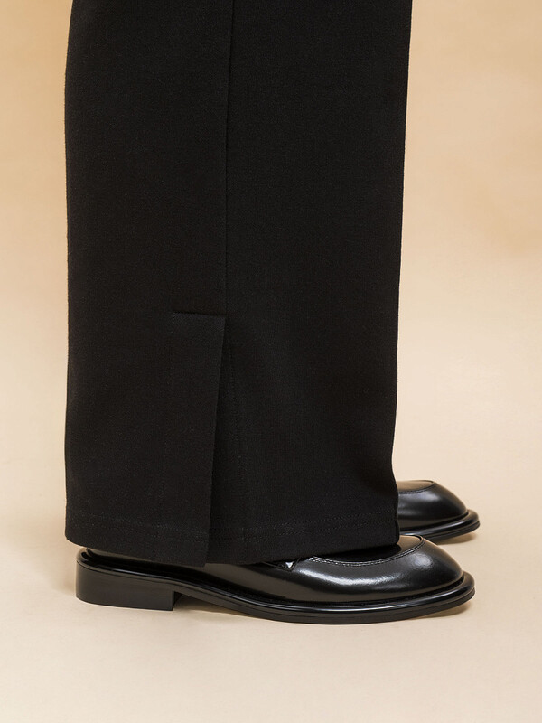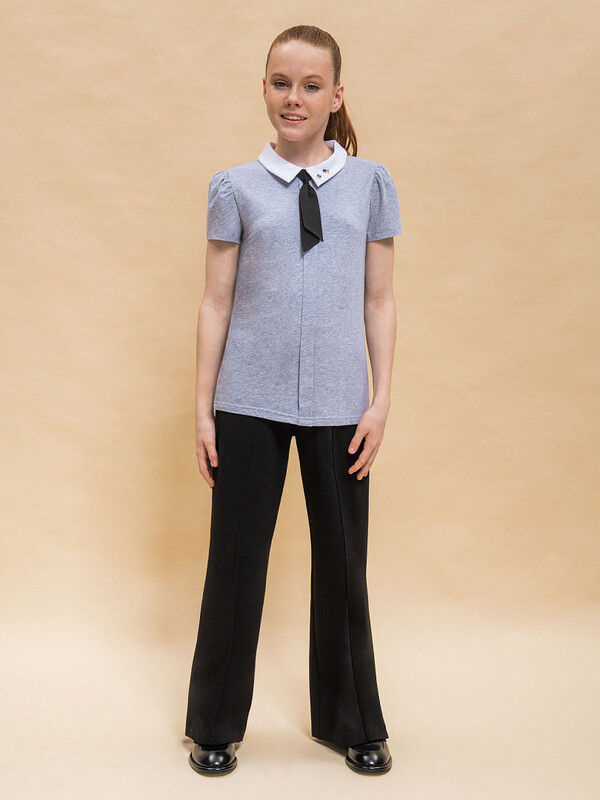 Трикотажные брюки прямого силуэта. Пояс на резинке по спинке с дополнительной встроенной утяжкой на резинку с петельками. По переду боковые карманы и застрочены стрелки. Имитация застежки, гульфика. По правой спинке имитация прорезного кармана с листочкой. По низу изделия в боковых швах располагаются шлицы
