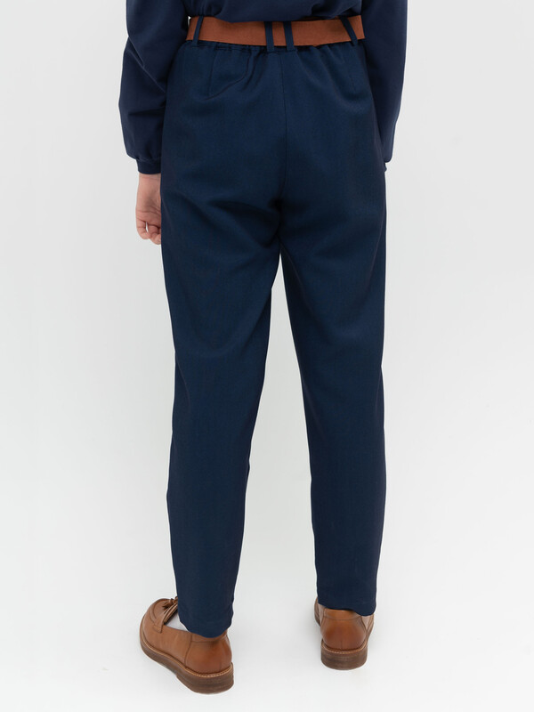 Увеличенный объем на бёдрах, свободный крой в коленях и легкое сужение книзу. Застёжка на пуговицу и молнию, защипы и вытачки по линии талии и эластичный пояс делают эту модель подходящей для любой фигуры.