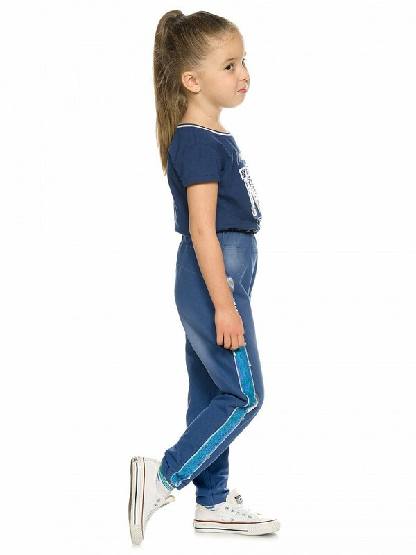 Ультрамариновые джеггинсы силуэта бананы - свободный объем сверху и зауженные книзу. Пояс на широкой внутренней резинке, с дополнительной регулировкой шнурком. По переду имитация карманов, вдоль боковых швов лампасы из переливающихся переворачивающихся пайеток.