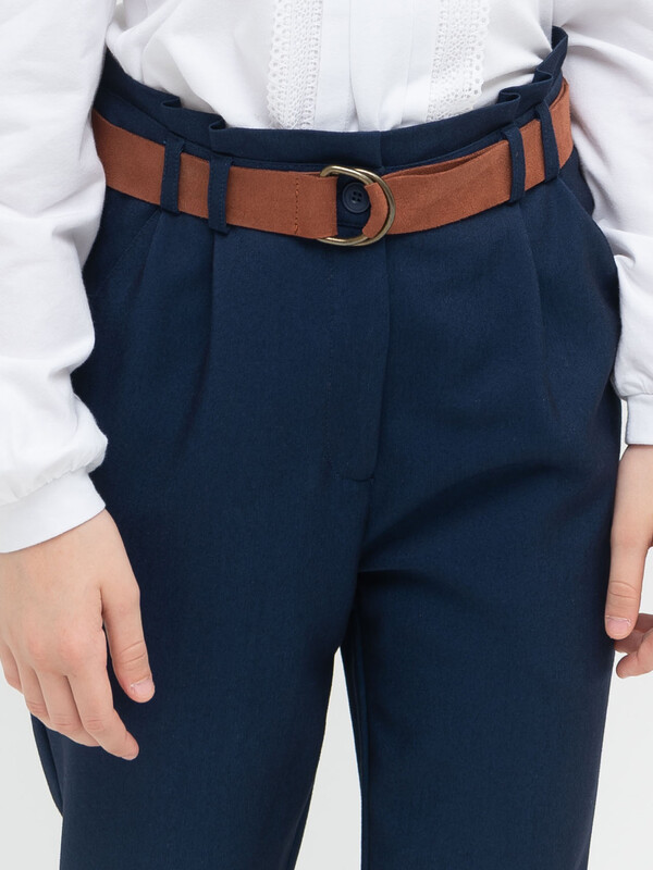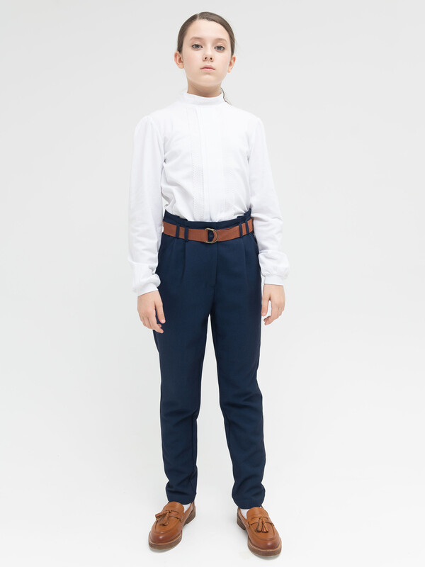 Брюки умеренного объема из костюмной ткани для девочки. Ткань легкая и прочная, почти не мнется. Брюки комфортно носить, за ними легко и просто ухаживать. Пояс декорирован элементом со складками, имеет шлевки под ремень и внутренний эластичный шнур на пуговицах для регулировки объема. Молния надежно скрыта гульфиком. Карманы имеют комфортный вход для рук, их удобно использовать по прямому назначению. Брюки идеальны для создания школьного образа на каждый день и торжественных случаев.