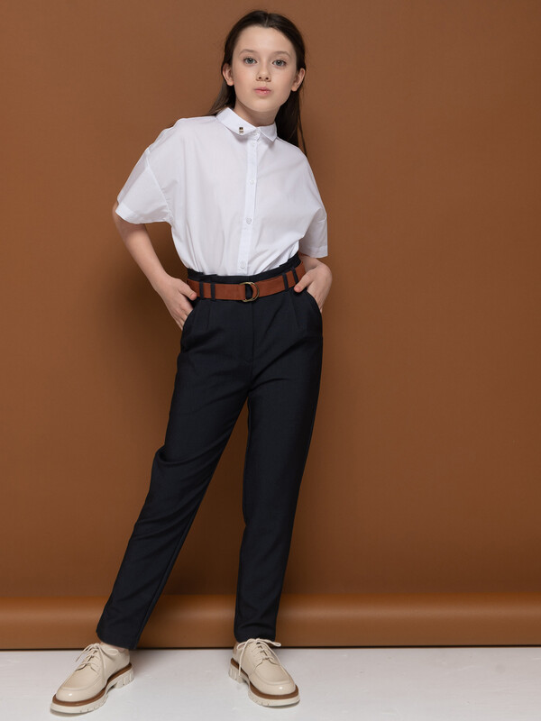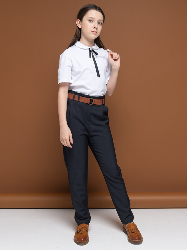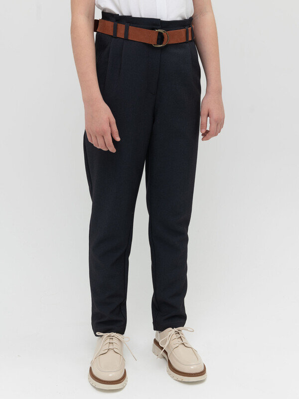 Брюки умеренного объема из костюмной ткани для девочки. Ткань легкая и прочная, почти не мнется. Брюки комфортно носить, за ними легко и просто ухаживать. Пояс декорирован элементом со складками, имеет шлевки под ремень и внутренний эластичный шнур на пуговицах для регулировки объема. Молния надежно скрыта гульфиком. Карманы имеют комфортный вход для рук, их удобно использовать по прямому назначению. Брюки идеальны для создания школьного образа на каждый день и торжественных случаев.