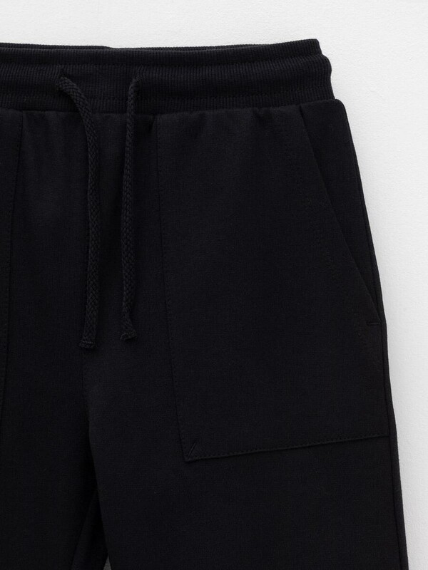 Брюки для мальчика из мягкого петельчатого трикотажа. Эластичный пояс на резинке регулируется по ширине с помощью шнурка. По бокам два удобных накладных кармана. Внизу эластичные манжеты.