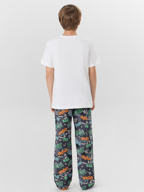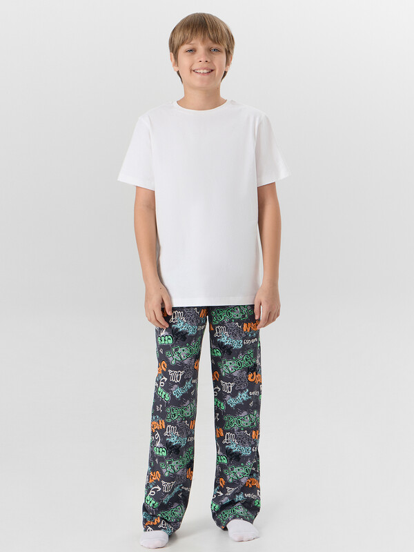 Брюки домашние для мальчиков, длинные и прямые. Детали переда и сидения соеденены боковым швом. Пояс цельнокроеный с эластичной тесьмой внутри (внутрення резина Rv30), ширина 30 мм.