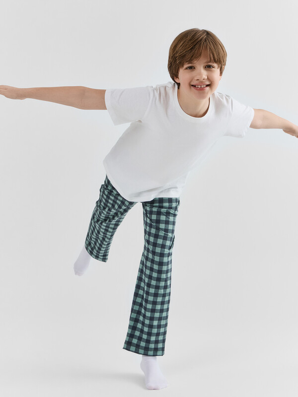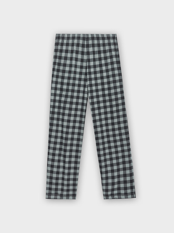 Брюки домашние для мальчиков, длинные и прямые. Детали переда и сидения соеденены боковым швом. Пояс цельнокроеный с эластичной тесьмой внутри (внутрення резина Rv30), ширина 30 мм.