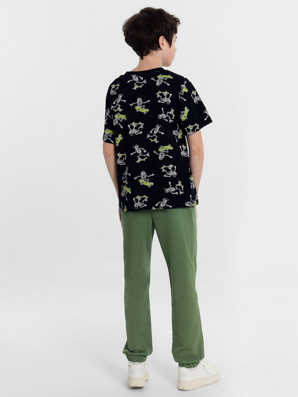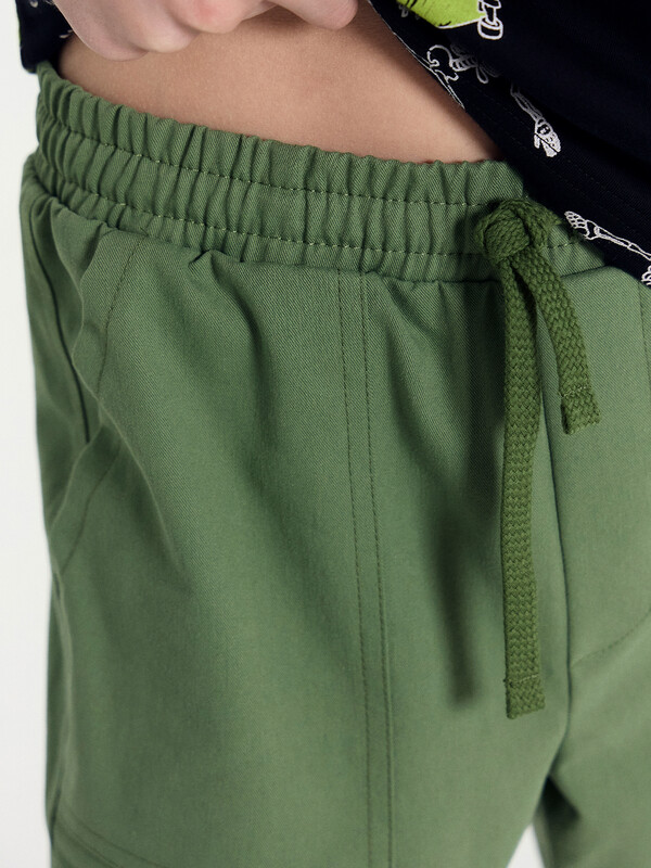 Брюки прямого силуэта. Посадка средняя. Пояс отрезной, внутрь застрочена эластичная тесьма и шнур. По поясу две декоративные строчки. На передних деталях накладные карманы с наклонным входом. Ложный гульфик. По низу изделия внутрь застрочена эластичная тесьма.