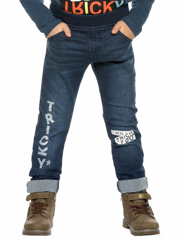 Утепленные джинсы для мальчиков умеренного объёма с 5 ю карманами и металлической фурнитурой. На правой брючине мягкий принт, надпись Хитрый, на левой rubber принт, надпись Я обхитрю тебя. Пояс с дополнительной регулировкой объема.
