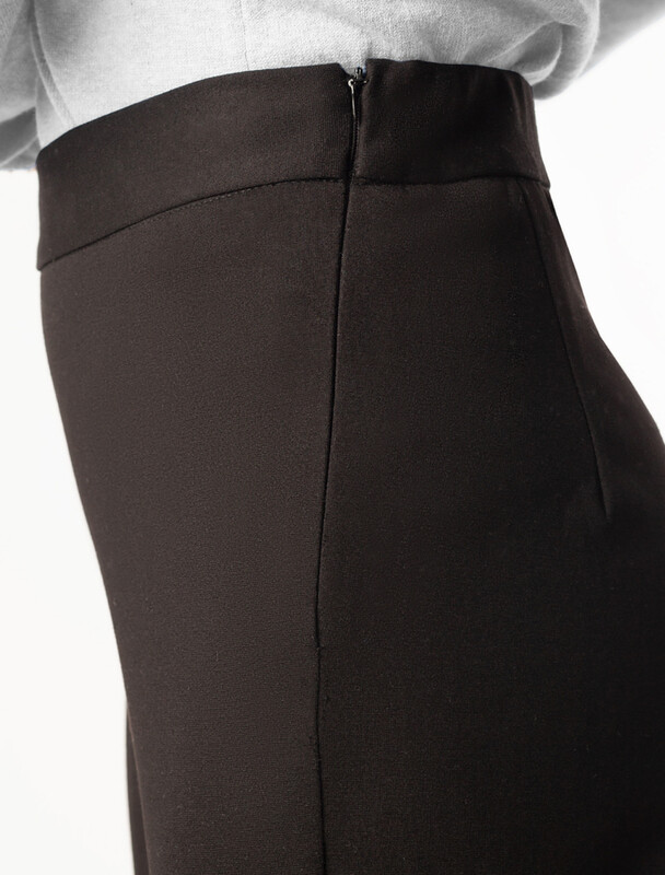 Брюки "дудочки" выполнены из плотного джерси. Высокая посадка зрительно увеличивают рост и визуально стройнит. Модель дополнена сзади эластичным поясом на резинке и боковыми разрезами по низу штанин. Одним кармашком спереди. Лаконичные брюки станут идеальным дополнением базового гардероба. С легкостью дополнят строгий офисный стиль и праздничный образ.