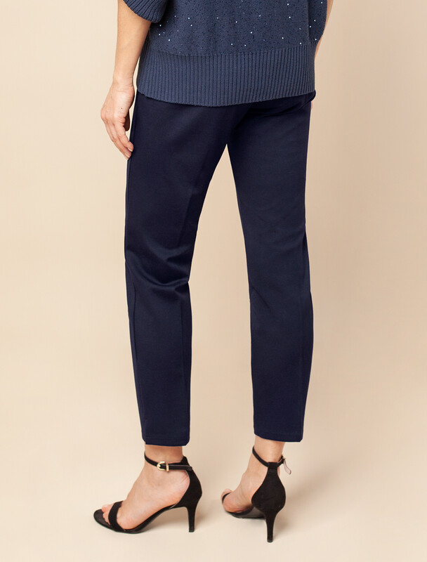Брюки "дудочки" выполнены из плотного джерси. Высокая посадка зрительно увеличивают рост и визуально стройнит. Модель дополнена сзади эластичным поясом на резинке и боковыми разрезами по низу штанин. Одним кармашком спереди. Лаконичные брюки станут идеальным дополнением базового гардероба. С легкостью дополнят строгий офисный стиль и праздничный образ.