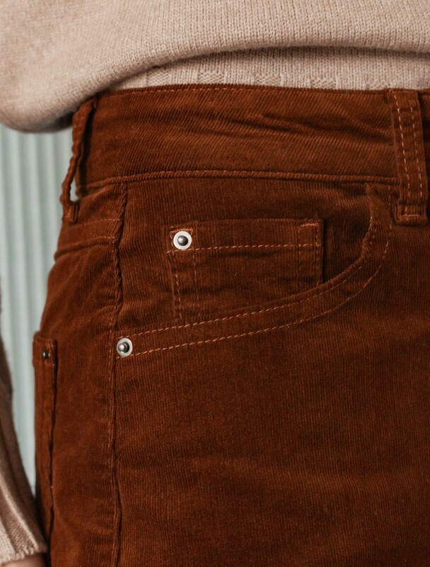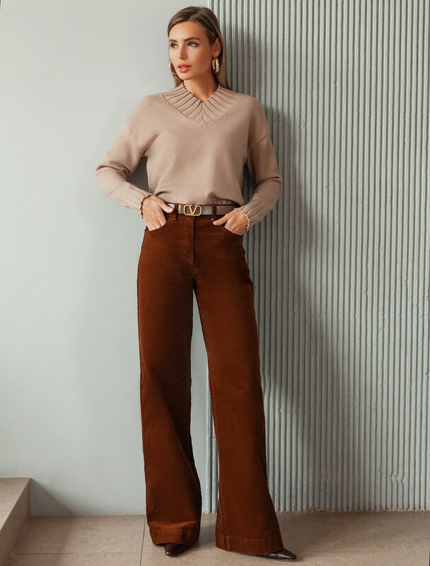 Брюки свободного кроя «трубы» выполнены из мягкого хлопкового микро-вельвета с добавлением эластана. Изделие комфортно садится по фигуре и не сковывает движения. Модель с пятью карманами, как у джинсов дополнена высококачественной фурнитурой с фирменным логотипом бренда. Идеально впишутся в повседневный образ, со свитером крупной вязки, курткой-косухой, ботинками на грубой подошве, челси и казаками.