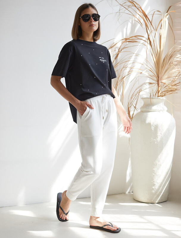 Брюки выполнены из футера двухнитки с эластаном. Модель зауженная к низу дополнена карманами и эластичным поясом с фактурой в рубчик. В пояс вставлен плоский хлопковый шнур в тон изделия с серебристыми наконечниками. Изделие дополнено металлическим логотипом бренда. Сочетается в костюме с жакетом D49.078, джемпером D49.079, D49.080 и футболкой D49.081
