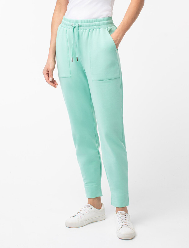 Брюки выполнены из футера двухнитки с эластаном. Модель зауженная к низу дополнена карманами и эластичным поясом с фактурой в рубчик. В пояс вставлен плоский хлопковый шнур в тон изделия с серебристыми наконечниками. Изделие дополнено металлическим логотипом бренда. Сочетается в костюме с жакетом D49.078, джемпером D49.079, D49.080 и футболкой D49.081