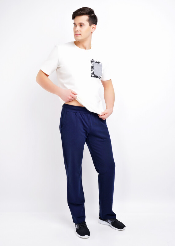 Брюки с отрезным поясом из кашкорсе, двумя карманами в боковых швах и одним накладным карманом сзади.