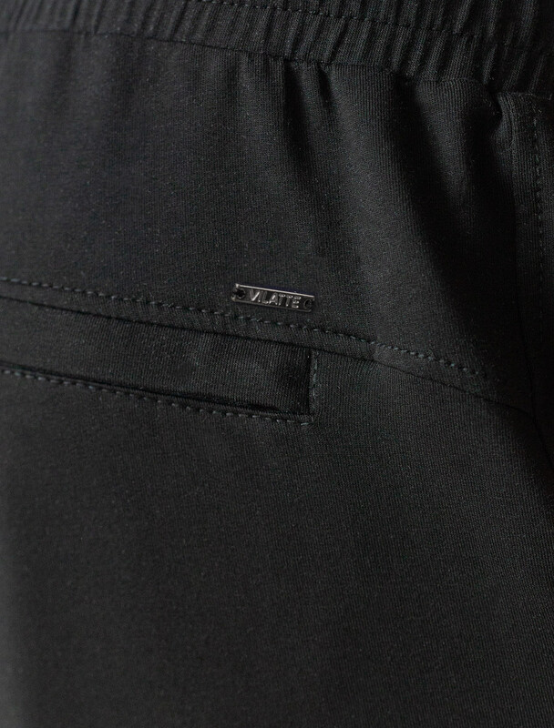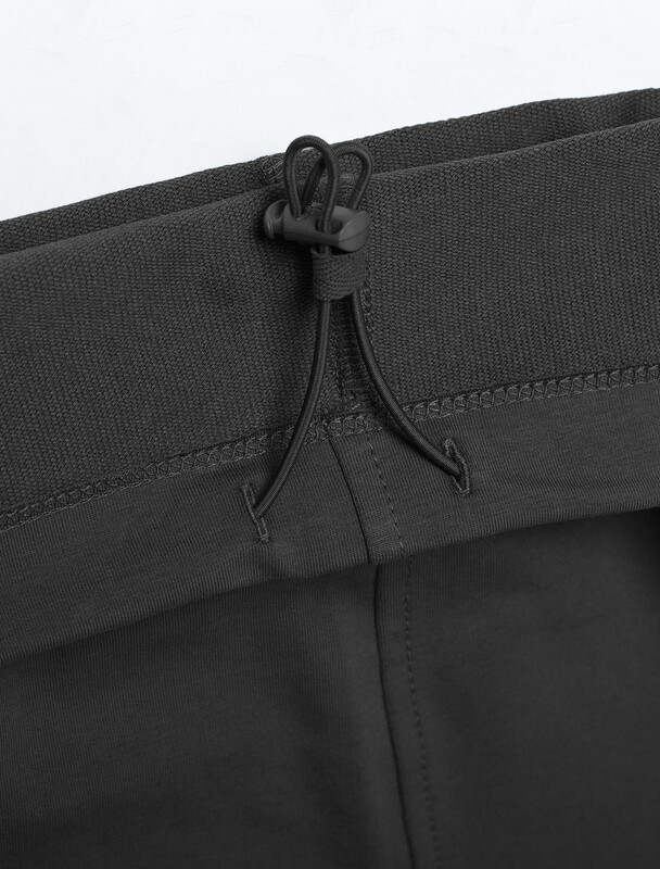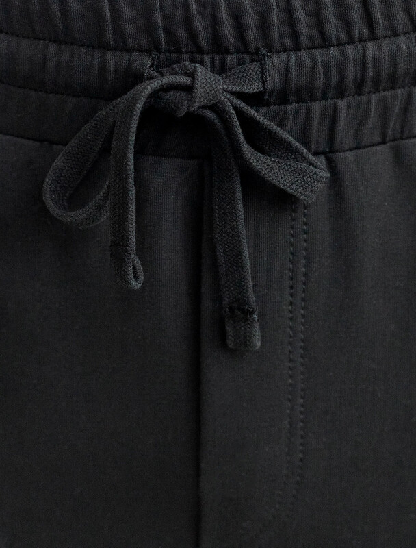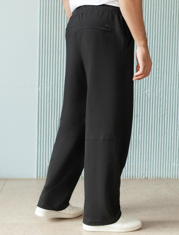 Свободные брюки черного цвета с эластичным поясом на резинке и шнуром с металлическим наконечником изготовлены из премиального футера двухнитки. Натуральная ткань, в составе которой хлопок и эластан, отличается дышащими свойствами и мягкостью на ощупь, обеспечивает комфорт и удобство в повседневной носке. Трикотажные брюки сохраняют свой первоначальный вид после многочисленных стирок, что делает их практичными для активного использования. Повседневные брюки дополнены карманами по бокам и одим задним карманом на молнии, что позволяет удобно хранить необходимые мелочи. Внизу расположены затяжки на стопорах, тем самым можно регулировать посадку под индивидуальные предпочтения каждого мужчины.