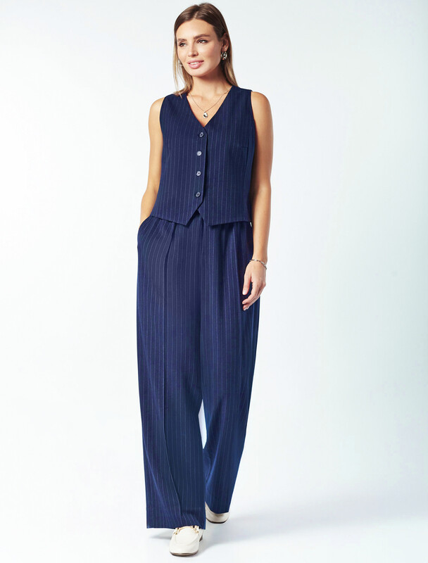 Брюки свободного кроя выполнены из костюмной ткани в полоску. Модель с карманами и поясом на резинке дополнена регулируемым шнурком из основной ткани. Изделие не сковывает движений и подходит для любого типа фигуры. Сочетается в костюме с жилетом D27.001