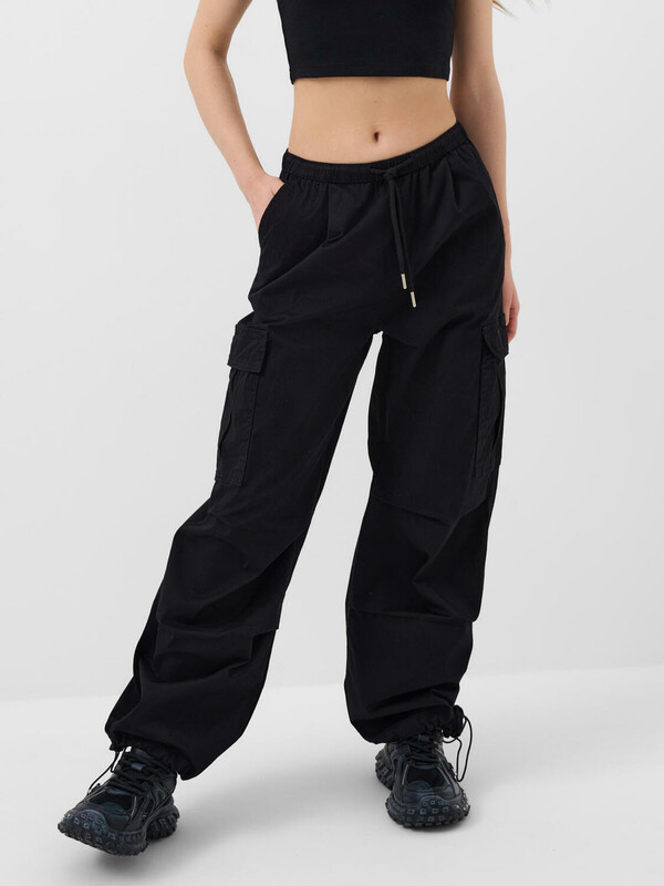 Брюки карго для девочки подростка. Выполнены из плотного хлопкового твилла. Модель имеет заниженную посадку и свободный крой с утяжками внизу, которые позволяют регулировать ширину брючин. Пояс на резинке с дополнительной регулировкой шнуром. На бедрах расположены накладные карманы на липучке, а также боковые карманы.