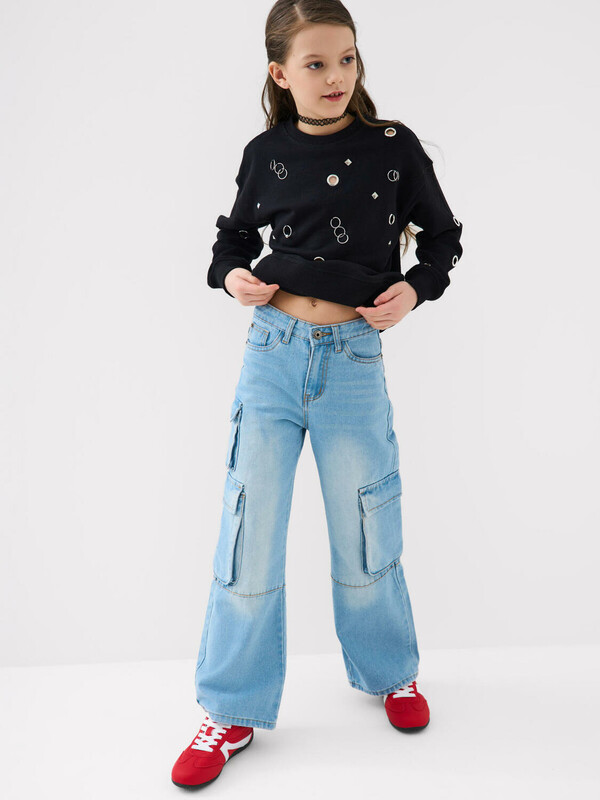Джинсы карго для девочки подростка. Выполнены из классического синего денима и имеют прямой свободный крой. Джинсы застёгиваются на молнию и болт. Внутри пояса есть регулируемая резинка с пуговицей для удобства посадки. Благодаря большому количеству карманов — два спереди, два сзади и по два боковых — модель выглядит современно и функционально. Декоративные элементы варки придают джинсам модный винтажный вид.