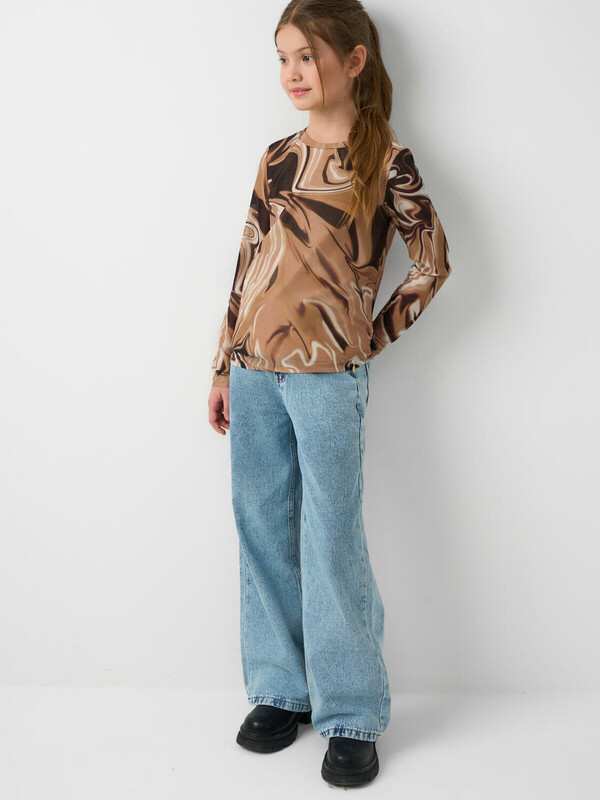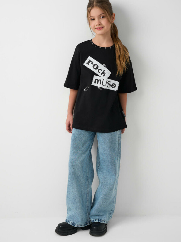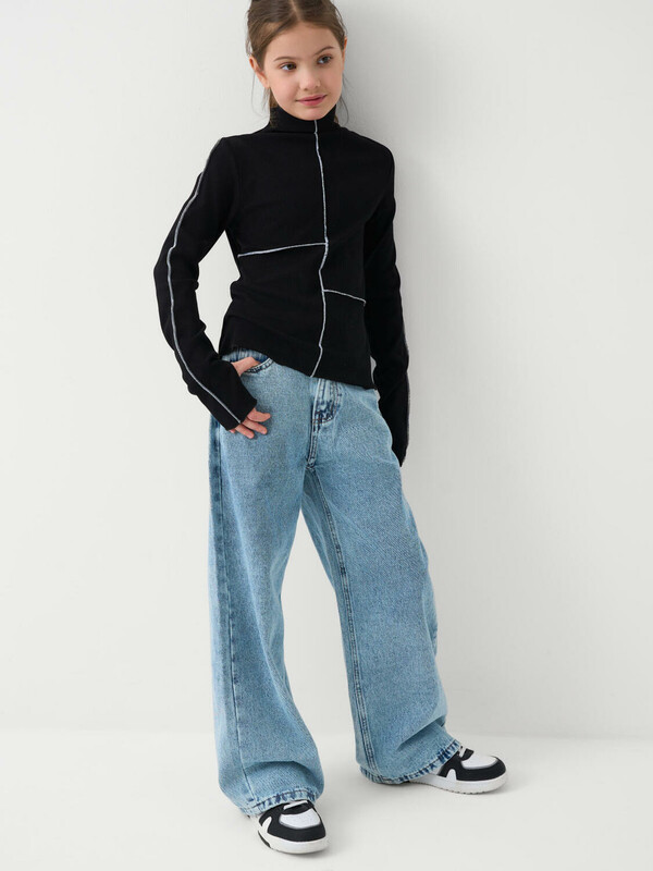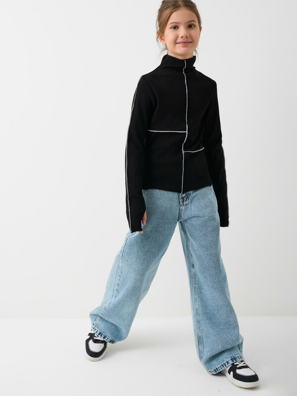 Классические прямые джинсы для девочки подростка. Застежка на молнию и болт. В поясе предусмотрена регулируемая резинка с внутренней пуговицей для лучшей посадки. Спереди — два кармана, сзади — два накладных кармана. Джинсы украшены контрастной строчкой.