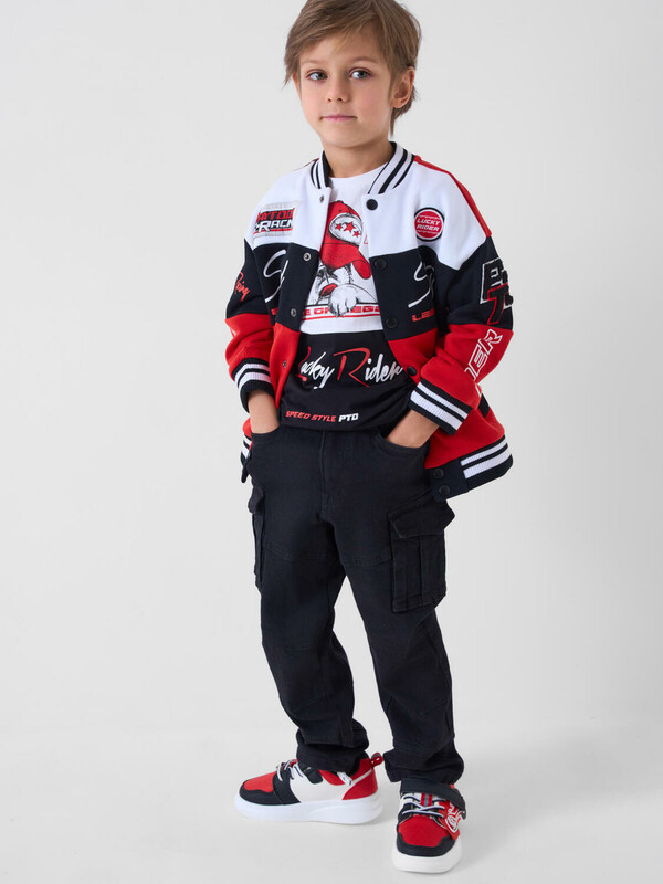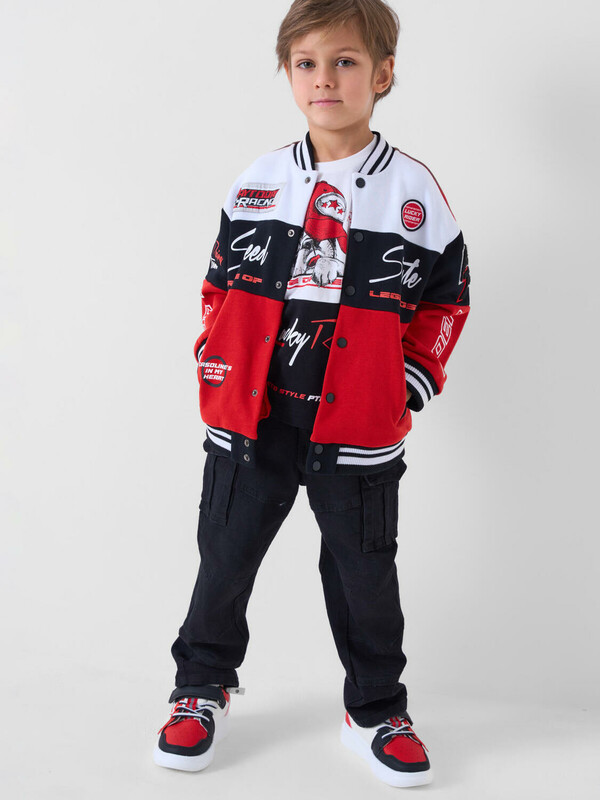 Детские джинсы карго для мальчика. Модель с прямым кроем и средней посадкой, выполненные из плотного денима. В дизайне предусмотрено много карманов: боковые, большие накладные-карго и два на задней части. Основная застёжка — болт и молния, в поясе встроена резинка, а также есть шлёвки под ремень. Карманы на бедрах закрываются на скрытые магнитные кнопки. Спереди есть декоративный шеврон, сзади — текстильная нашивка на поясе.