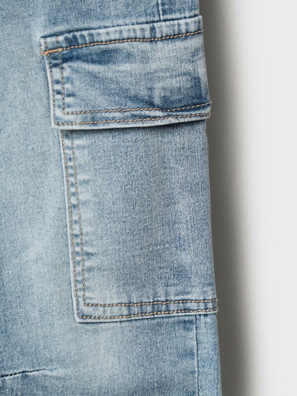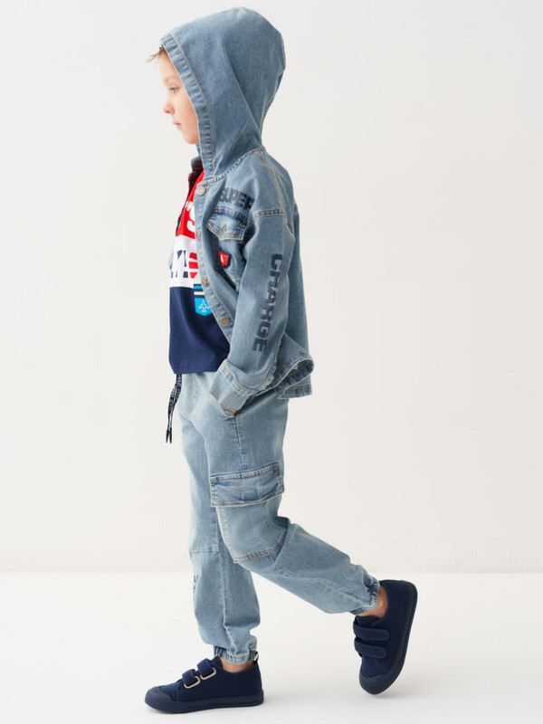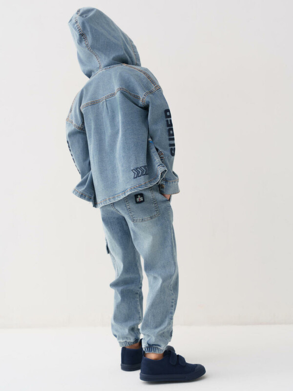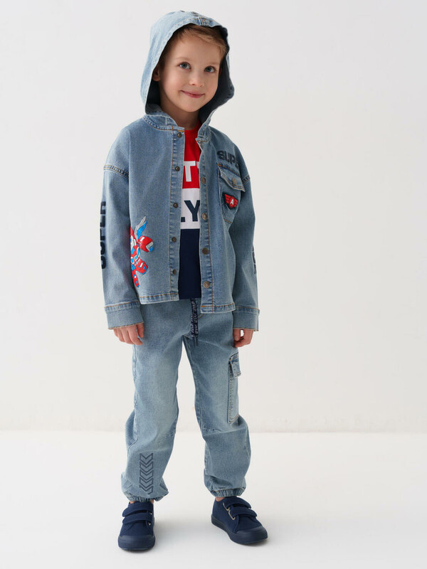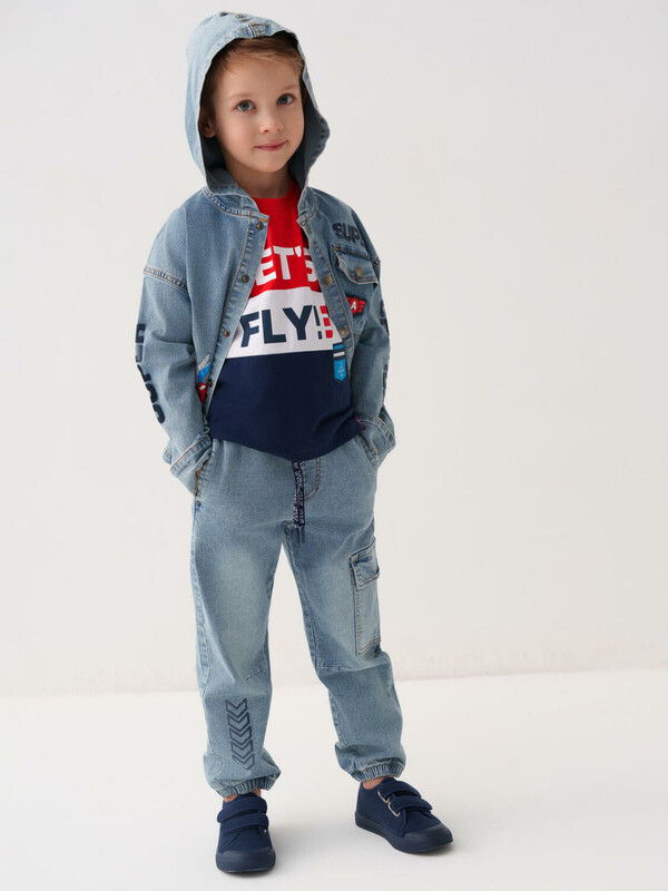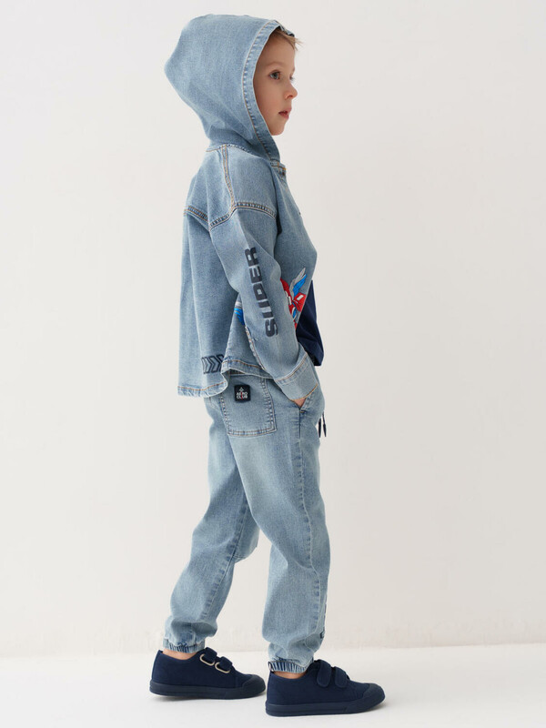 Детские джинсы-джоггеры для мальчика. Выполнены из светло-голубого денима. Модель со средней посадкой и комфортным свободным кроем, идеально подходит для активных мальчиков. Пояс на резинке дополнен регулируемым шнуром. Боковые карманы, один накладной сбоку и один сзади.