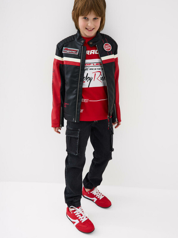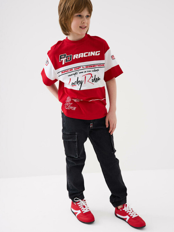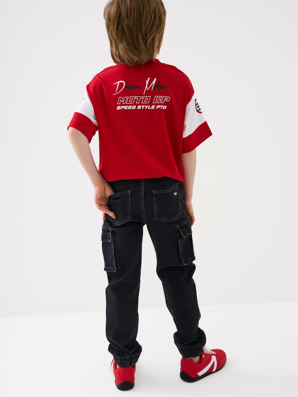 Джинсы-джоггеры для мальчика подростка, выполненные из сверхудобного эластичного материала Loop Denim. Loop denim имеет внешний вид классической джинсы, а по тактильным ощущениям мягкий и комфортный, как трикотаж. Свободный крой с заужением к низу. Пояс на резинке с утягивающим шнурком. Объёмные боковые накладные карманы с клапанами на липучке. Сзади — два накладных кармана. Низ брюк собран на резинку. По брюкам расположены декоративные складки и строчки, имитирующие заломы. На заднем кармане — силиконовая нашивка с логотипом.