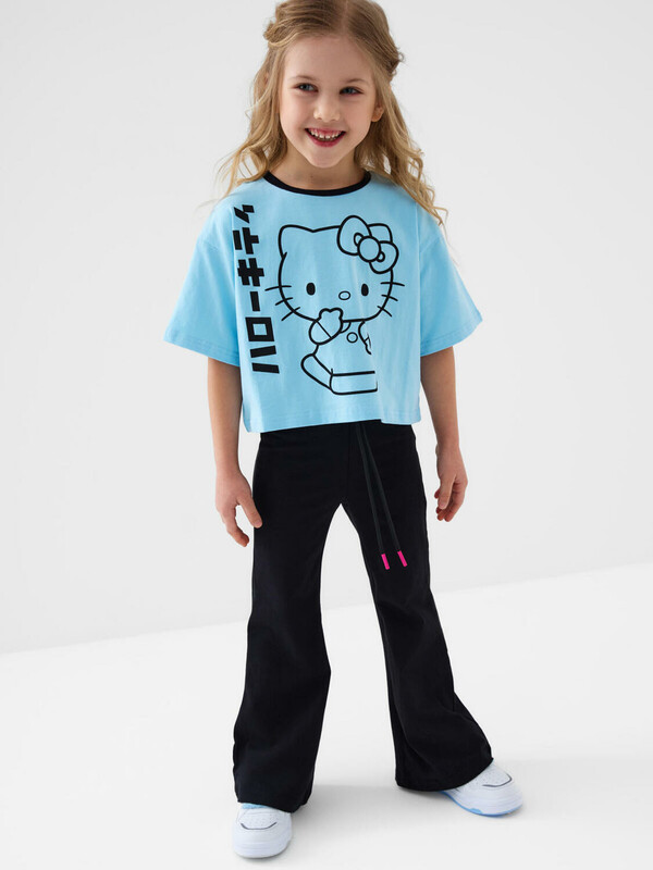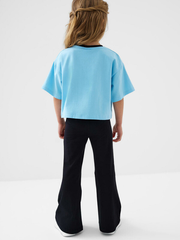 Детские брюки клеш для девочки. Комплект из 2 пар выполнен из хлопкового трикотажа джерси. Средняя посадка на талии. Пояс на резинке, дополнительно регулируется шнурком.