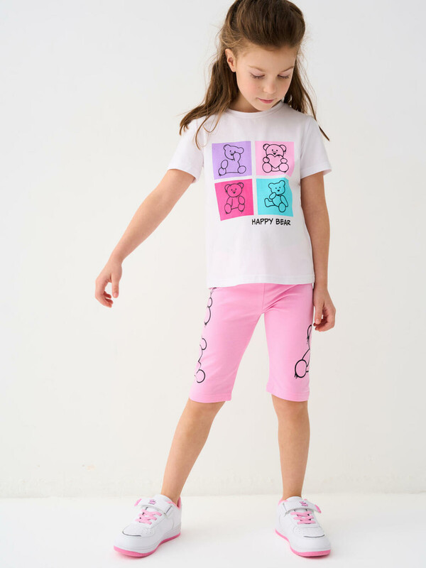 Набор детских легинсов для девочки. Комплект состоит из двух пар укороченных легинсов. Первая пара выполнена в розовом цвете, вторая — с ярким принтом с медведями. Обе модели имеют высокую посадку и эластичный пояс, который хорошо фиксирует изделие на талии. Материал - мягкий, хлопковый трикотаж.