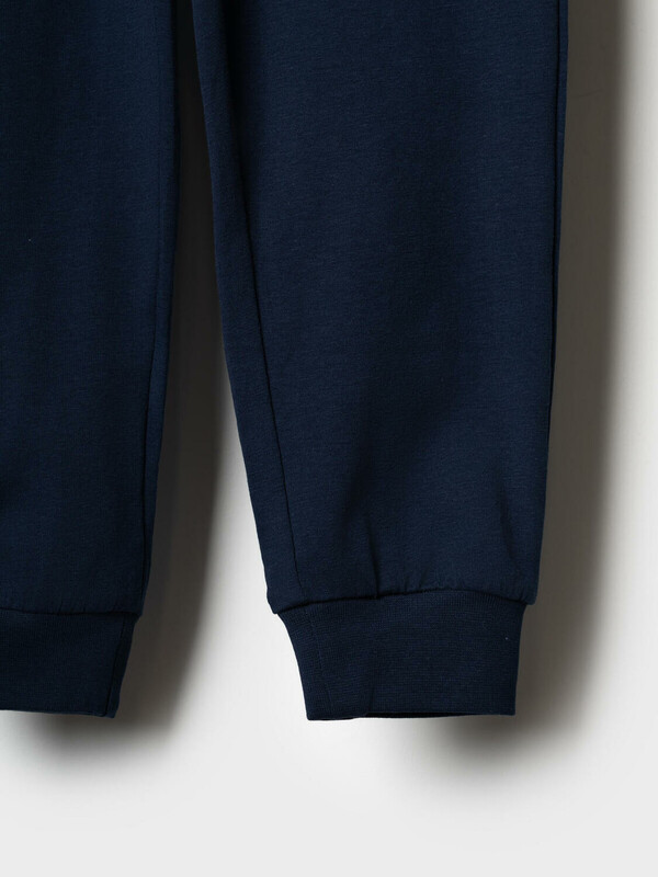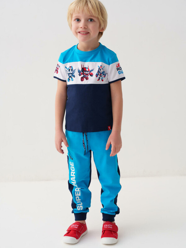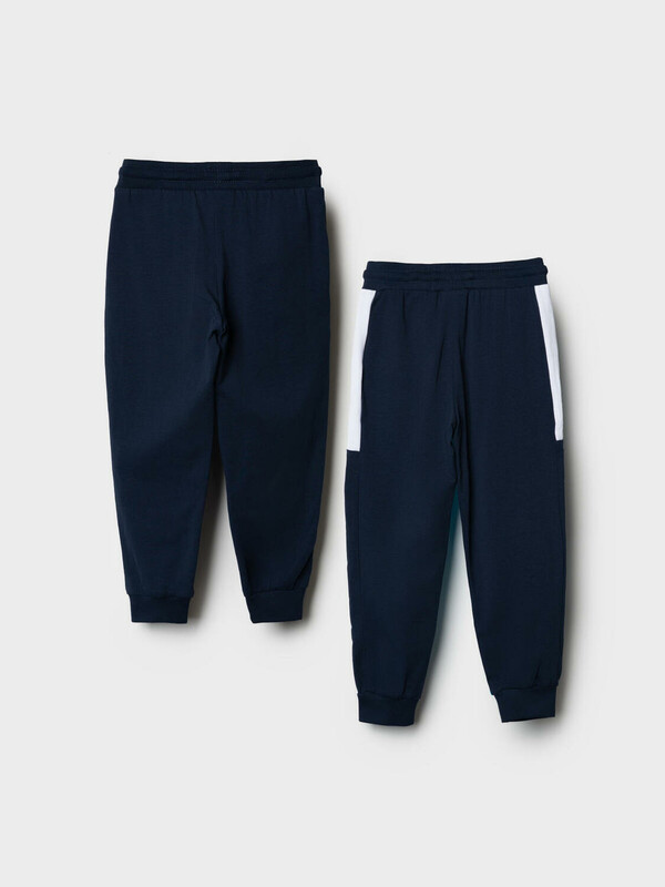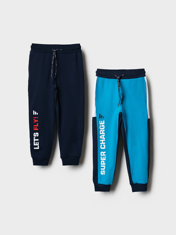 Комплект детских брюк-джоггеров для мальчика. Набор из двух джоггеров выполнен из хлопкового трикотажа джерси. Модель прямого кроя со средней посадкой на талии. Пояс выполнен на резинке, дополнительно регулируется шнурком. По бокам — удобные карманы. В нижней части брючин предусмотрены эластичные трикотажные манжеты для лучшей фиксации. Украшены принтами.
